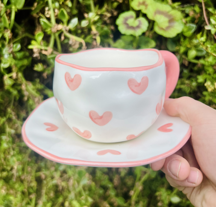 Ideal para regalar a esa persona especial que tanto quieres 💝. Esta taza irregular con plato, hecha a mano y decorada con tiernos corazones ❤️, tiene 300 ml de pura dulzura. Perfecta para disfrutar café ☕ o Té 🍵